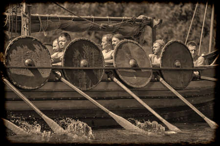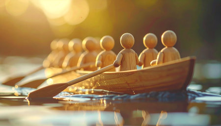 A dedicated crew of wooden figures rows in perfect synchrony, their oars dipping into the calm water as the golden light of sunrise illuminates their path.