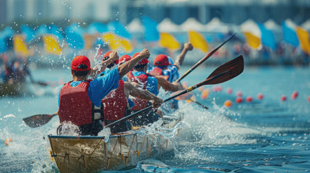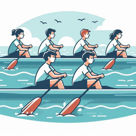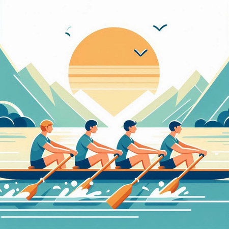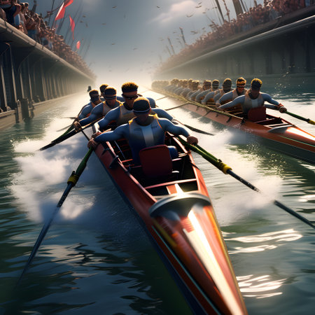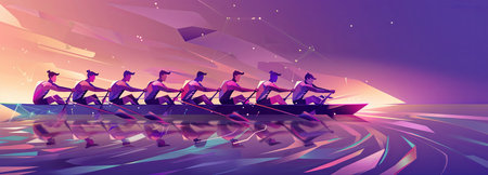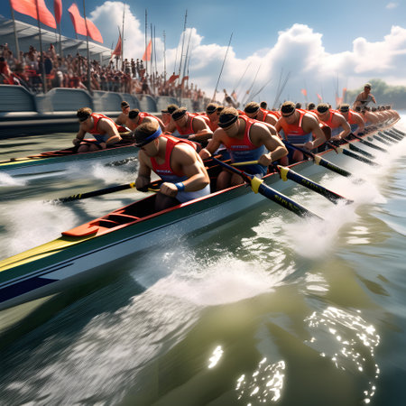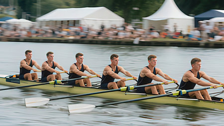 Synchronized rowers showcasing teamwork at summer olympics, perfecting oar strokes in unison