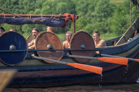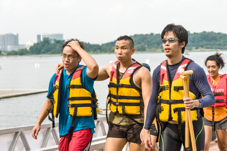 Pathumthani, Thailand - NOV 03, 2013 A rowing team at rest during Thai Long-tailed Boat Competition along river