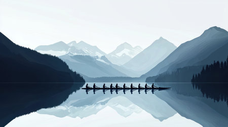 A group of rowers are paddling a boat across a lake. The mountains in the background create a serene and peaceful atmosphere