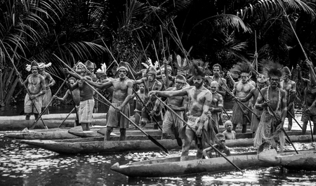 INDONESIA, IRIAN JAYA, ASMAT PROVINCE, JOW VILLAGE - JUNE 12: Warriors Asmat tribe are use traditional canoe.