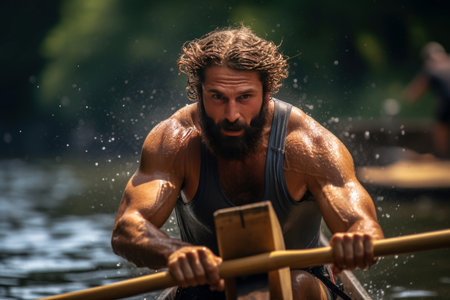 Skillful Man rows an oar in a canoe. River summer kayaking sport. Generate Ai
