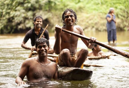 Western Province, Sri Lanka - 10.30.2011: A group of young Sri Lankan Men Row and play with a traditional wood kayak on a river in the forest in Western Province, Sri Lanka