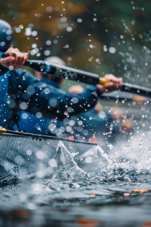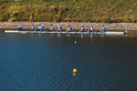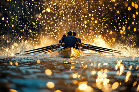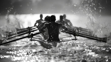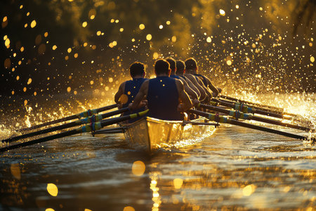 Synchronized rowers in competitive regatta with perfect water splashes in a harmonious scene