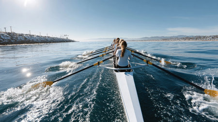 A group of determined rowers in a sleek boat demonstrates teamwork and athleticism while gliding over calm waters. The clear blue sky enhances the serene ambiance.