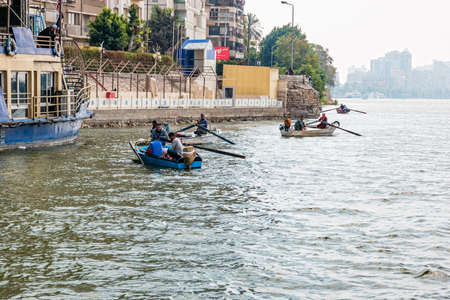 CAIRO, EGYPT - February 2021: Fisherman on a boat. Daily life on Nile river in Cairo, Egypt.