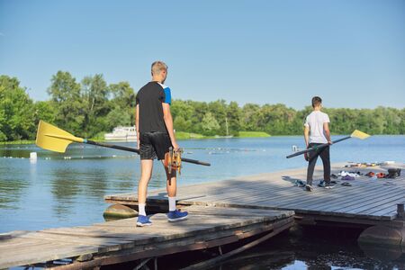 Boys teenagers walking with paddle for sport kayak boat, water sports, active healthy lifestyle of young males