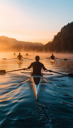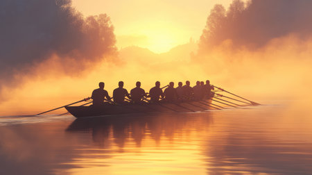 A group of rowers glide smoothly across a tranquil river as the sun rises, casting golden light through morning mist. The calm surrounding enhances the scene's beauty.