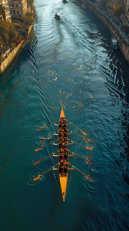 Rowers in sleek canoes glide through shimmering water, creating mesmerizing pattern. sunlight reflects off surface, enhancing serene atmosphere of teamwork and dedication