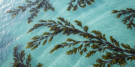 Lush green seaweed sways gently beneath the surface of tranquil turquoise water, showcasing the stunning ecosystem of a coastal environment on a sunny day.