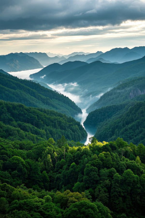 Valley forest shrouded in mist and natural landscape