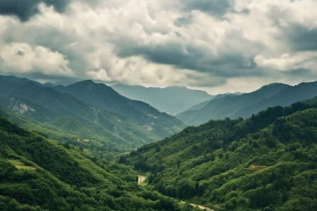Mist blankets the lush green mountains and dense forests of a scenic valley, creating a serene and majestic atmosphere. towering peaks and rich vegetation evoke a sense of tranquility and natural beauty. Generative AI