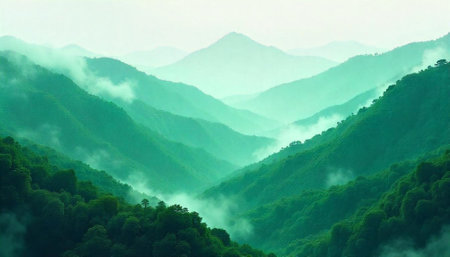 Misty mountain range with lush green forest landscape layers