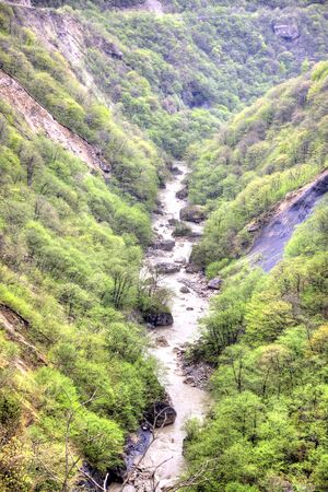 mountain river among stone rocks with green plants in the Martvili Canyon in Georgia in autumn
