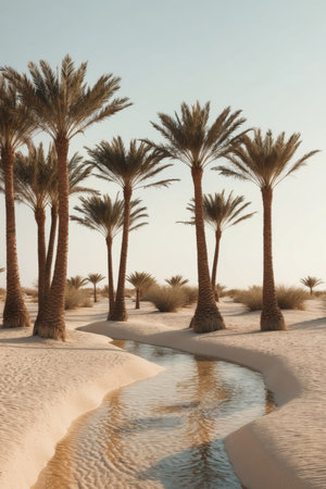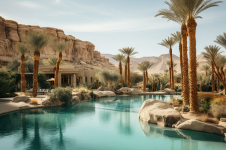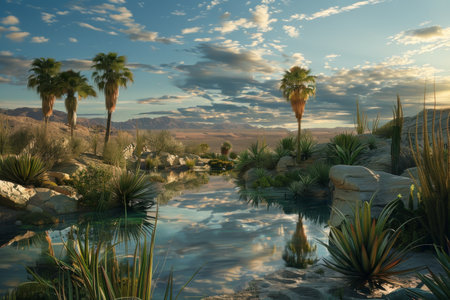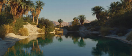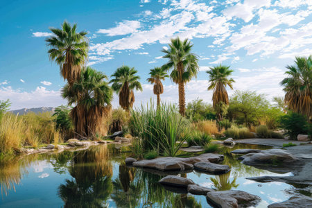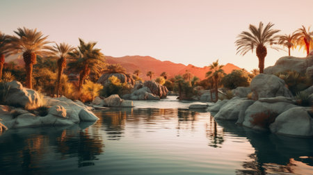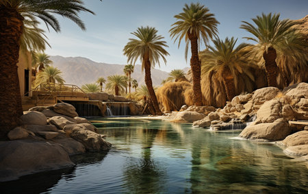 Desert oasis with tranquil reflecting pool surrounded by lush palm trees and serene landscape