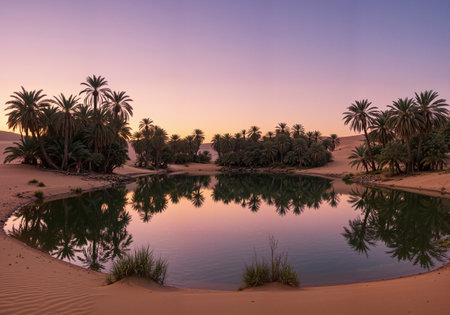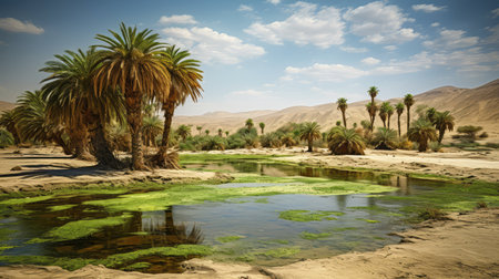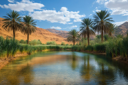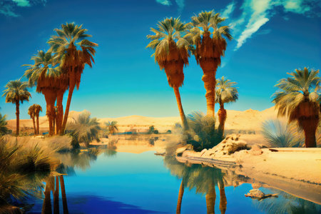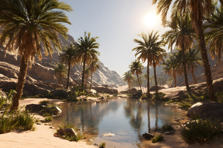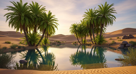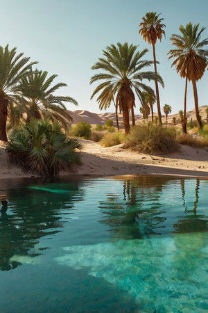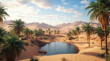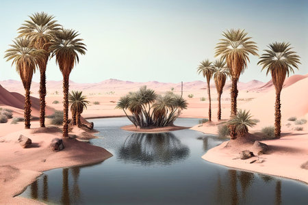 Oasis in a desert landscape with palm trees and a tranquil water reflection