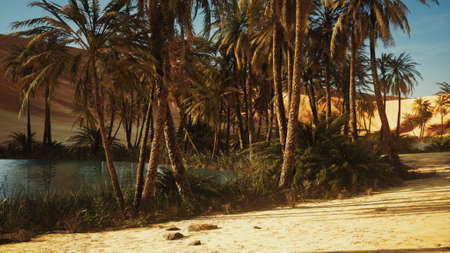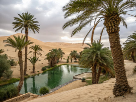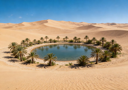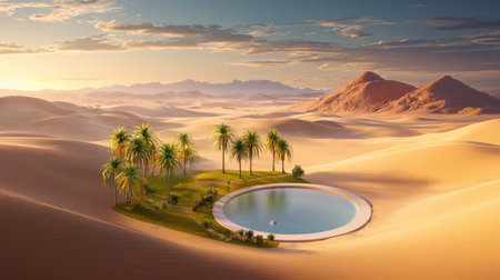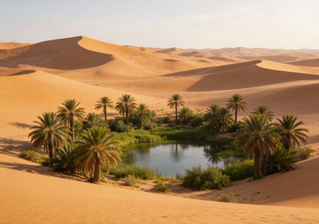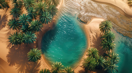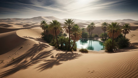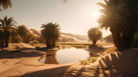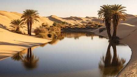 A tranquil oasis surrounded by lush palm trees sits peacefully amid expansive sand dunes. The still water reflects the vibrant greenery under the suns warm glow, creating a serene escape.