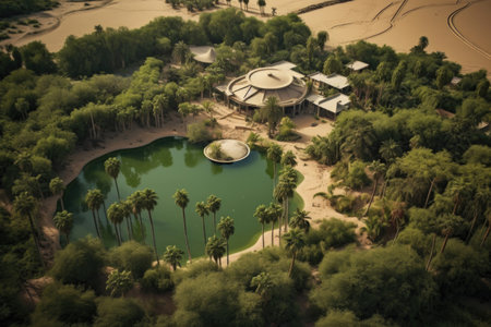 aerial view of a lush oasis surrounded by sand dunes, created with generative ai