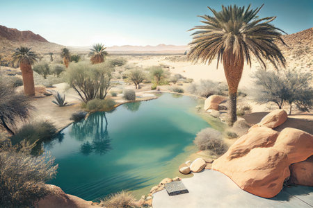 serene oasis with crystal-clear pool surrounded by desert landscape, created with generative ai