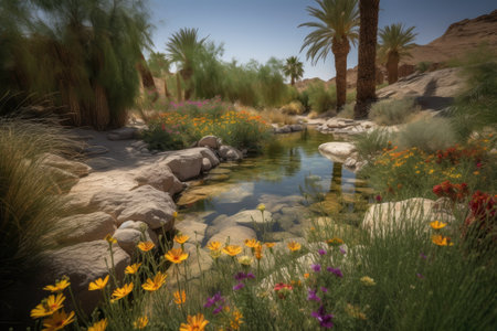 desert oasis, with close-up of colorful blooms and greenery, created with generative ai