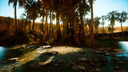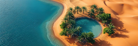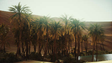Oasis in the Sahara desert with palm trees and blue lagoon