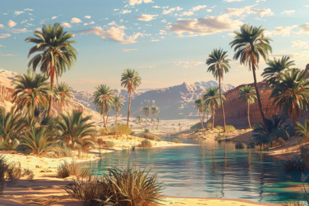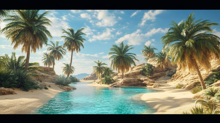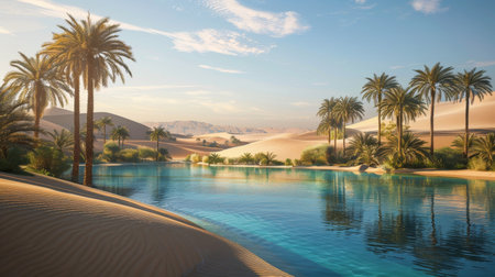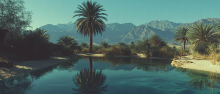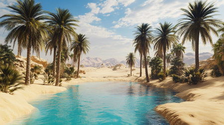 A stunning oasis provides a peaceful retreat in the heart of a desert, featuring lush palm trees, a serene water body, and majestic mountains against a sunny sky.