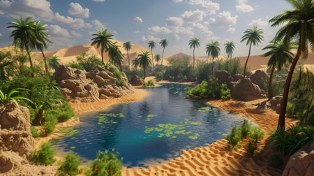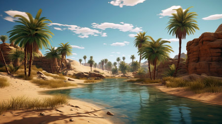 Vibrant oasis with palm trees and refreshing water amid a desert landscape