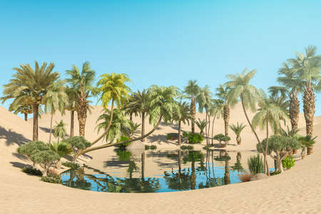 Aerial view of the lake in the desert with palm trees. 3d rendering