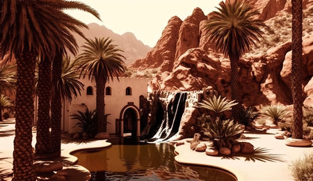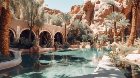 a 3d rendering of a water feature in a palm trees park at the oasis resort in caada del mare. this stunning image captures the essence of jessica drossin's style, with influences from caras ionut and nadav kander. the vintage aesthetics and richly layered composition make it reminiscent of a national geographic photo. this high-resolution 32k uhd image is a true masterpiece. ai generated