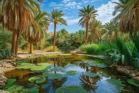 A pond with lush palm trees and vibrant water lilies in bloom, Desert oasis with palm trees and a small pond, AI Generated