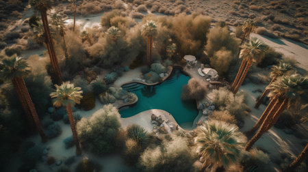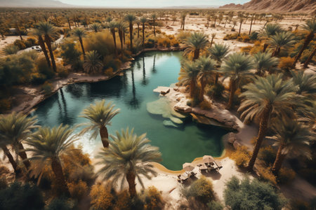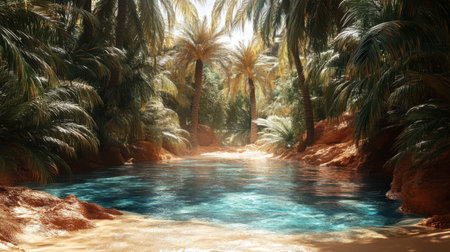 Desert oasis surrounded by lush palm trees and clear water inviting tranquility