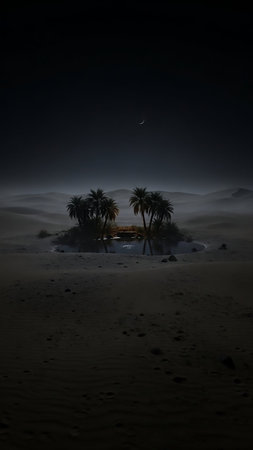 A small oasis with several palm trees and a reflective pool of water is nestled among desert sand dunes under a dark sky with a crescent moon.