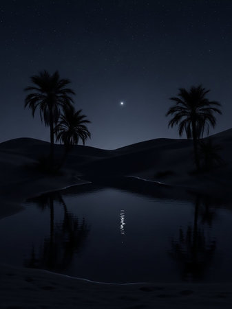 A serene desert oasis at night. Silhouettes of palm trees stand against a dark blue, starry sky. Their reflections are visible in the still, dark water of a small pool nestled among the sand dunes.
