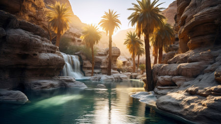 desert oasis, with hidden waterfall and pool of crystal-clear water, created with generative ai