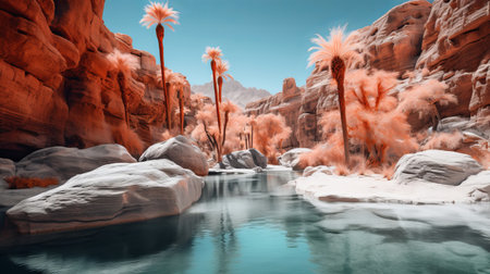desert lake with palm trees and rocks captured in a time lapse scene, featuring y2k aesthetic, schlieren photography, subtle gradients, poolcore vibes, and a color palette of orange and aquamarine. the image showcases the beauty of the american tonalism style, with stunning details in 32k uhd resolution. ai generated