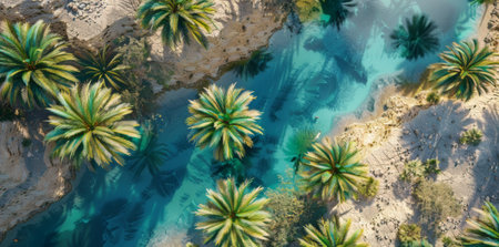 AI Generated. A Desert Oasis with Palm Trees and a Stream of Water