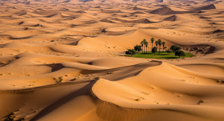 Expansive golden desert landscape featuring rolling sand dunes and a vibrant green oasis with lush palm trees and foliage, creating a striking contrast in the arid environment.