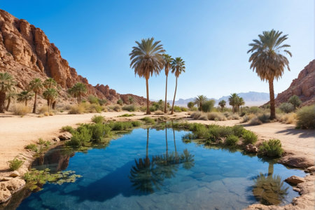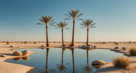 A tranquil oasis with palm trees and reflections in a desert setting, offering a peaceful escape amidst arid surroundings.