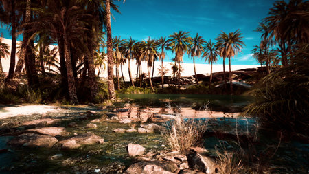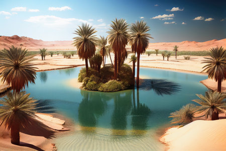 oasis with palm trees and clear blue sky in the desert, created with generative ai