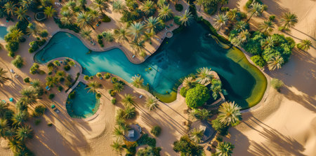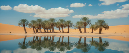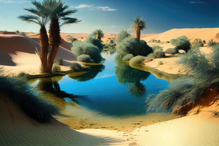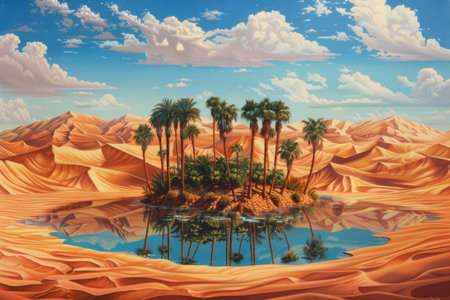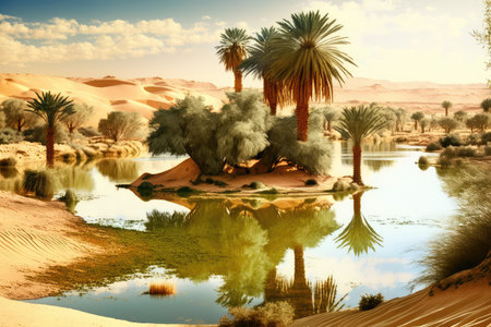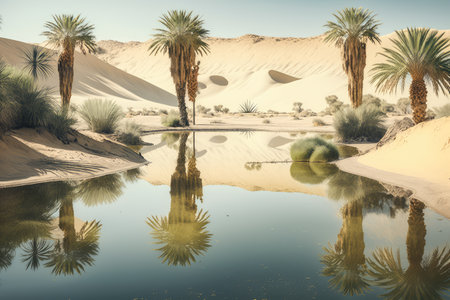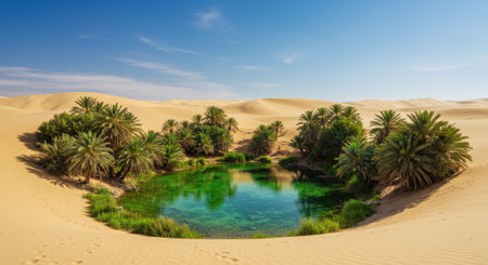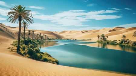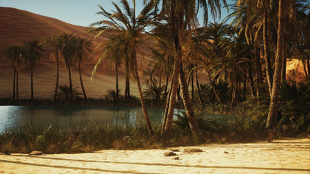 A tranquil oasis surrounded by lush palm trees sits peacefully amid expansive sand dunes. The still water reflects the vibrant greenery under the suns warm glow, creating a serene escape.