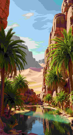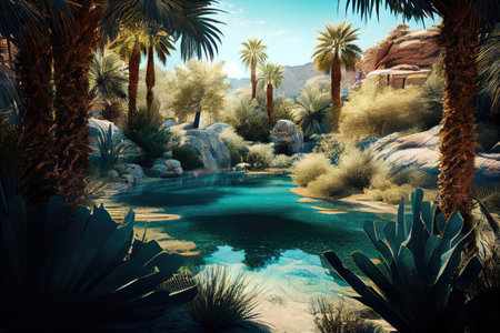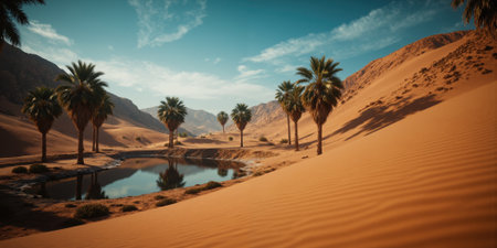 Vibrant oasis with palm trees and refreshing water amid a desert landscape