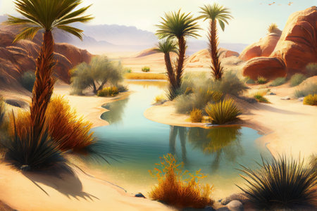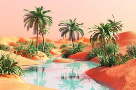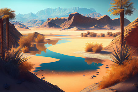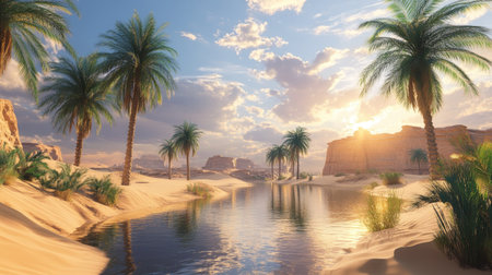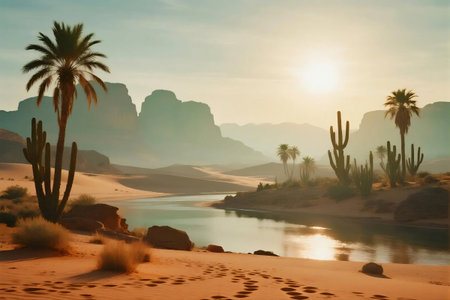 Stunning desert oasis scene with a calm water stream, cactus, and palm trees under the warm golden sunset. Tranquil landscape perfect for nature, travel, or exotic destination themes