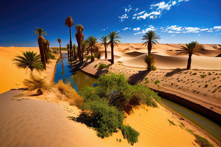 water in oasis of sahara desert among trees and vegetation of lake in the desert, created with generative ai