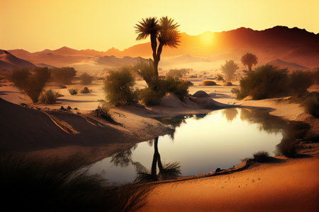 oasis with sun setting over the desert, casting warm light on tranquil scene, created with generative ai