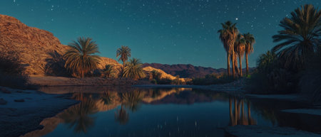 Desert oasis with palm trees reflects the starry night sky in a serene landscape