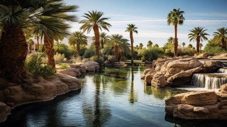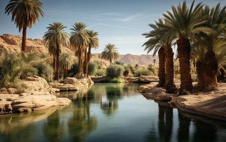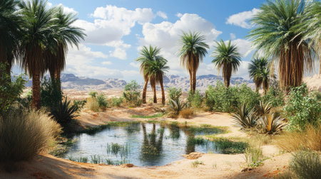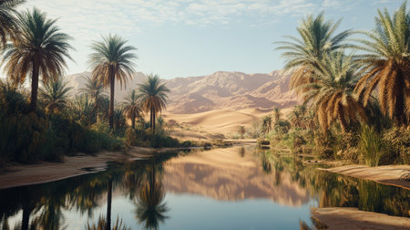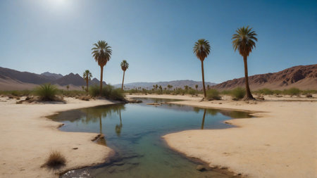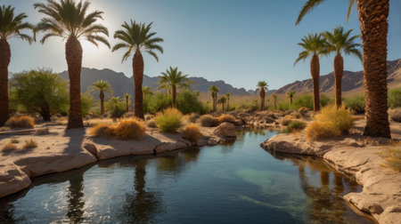 A stunning oasis provides a peaceful retreat in the heart of a desert, featuring lush palm trees, a serene water body, and majestic mountains against a sunny sky.