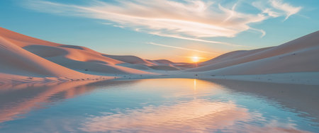 AI Generated. Stunning desert oasis at sunset with reflective water and dunes in tranquil landscape