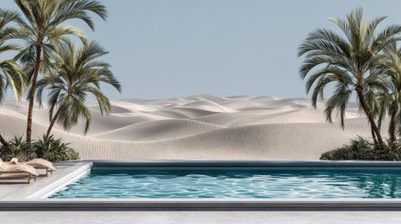 This image presents a serene outdoor scene featuring a pool and a desert landscape backdrop. Lush palm trees frame the pool against a light blue sky. The composition uses symmetry. Suitable for various uses, it evokes a feeling of leisure and relaxation.