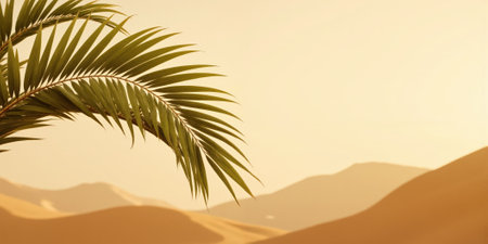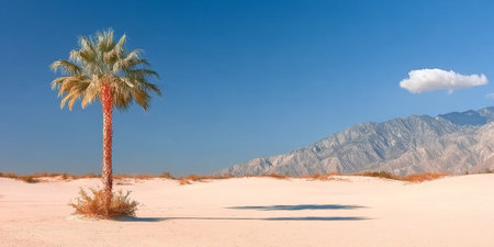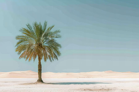 Tranquil Desert Landscape Featuring a Lone Palm Tree Under Bright Blue Skies and Soft Beige Sand