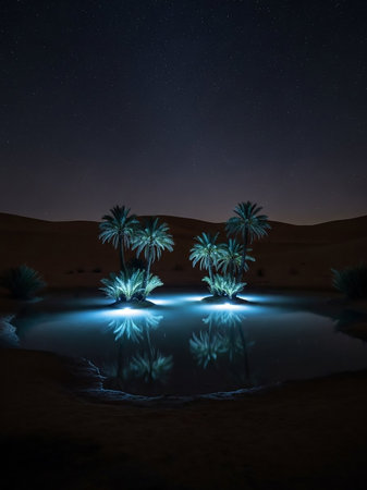 A vibrant desert oasis at night, with palm trees illuminated by blue light, casting reflections on the still water under a starry sky.